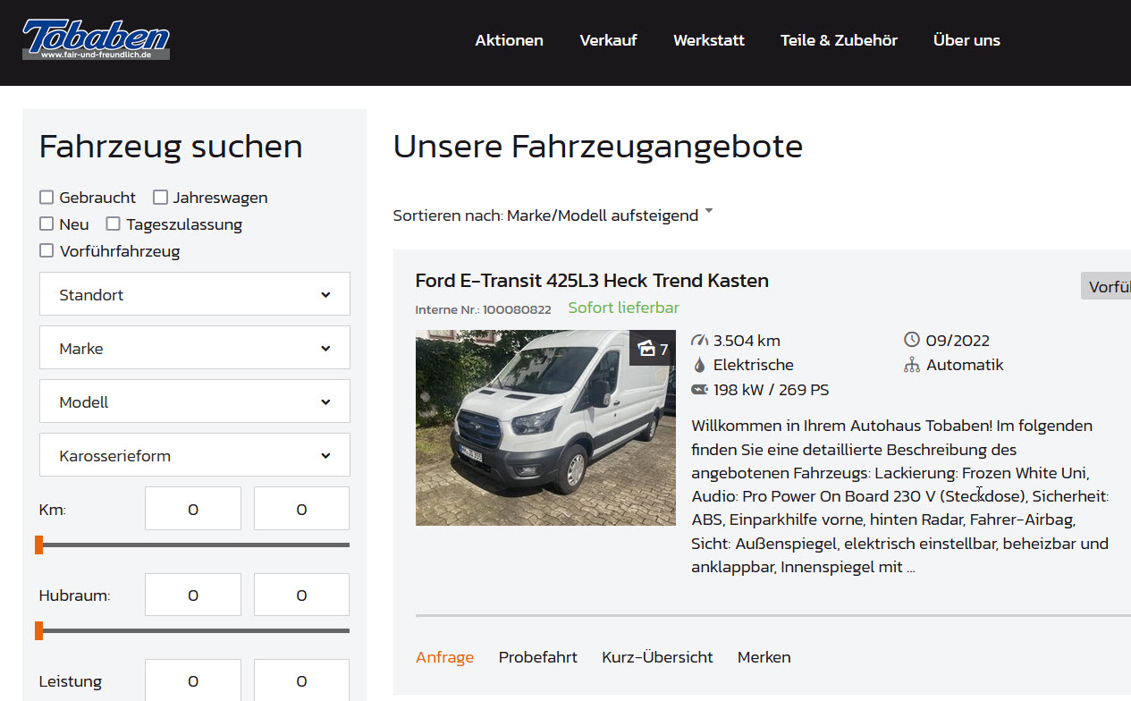 Erleben Sie die Vorteile von Elektroautos und profitieren Sie von einer umweltfreundlichen Mobilität, geringeren Betriebskosten und einer einfachen Ladung an über 600.000 Ladestationen in ganz Europa. Mit modernster Technologie und innovativem Design bieten vollelektrische Fahrzeuge wie der Ford Explorer, Ford Mustang Mach-E und Ford E-Transit ein Fahrerlebnis der Extraklasse. Wagen Sie den Schritt in die Zukunft der Elektromobilität mit Ihrem Autohaus Tobaben.